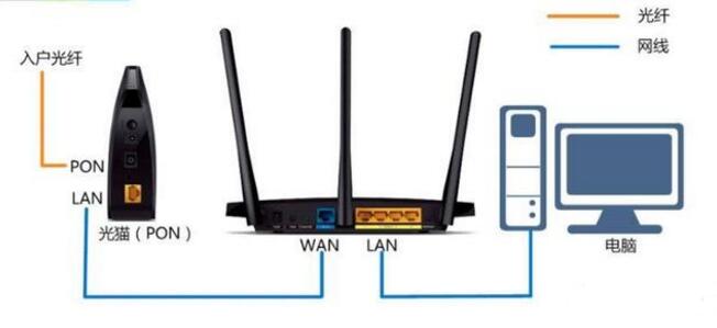 路由器的WAN口与光猫的数据端口通过网线进行连接,实现拨号功能,为局域网的有线和无线设置提供数据接入。