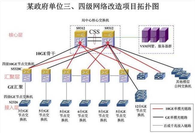 4.多层交换机:具有二层到七层的功能,常用的为四层交换机,可以通过IP地址、MAC地址、协议等进行寻址访问,核心层使用的较多,但是对于大部分小型网络而已,核心层也可以采用三层交换机进行传输,核心层的主要作用是将汇聚层的数据传输到互联网中,通常在一幢大楼中,核心层设备不会太多;