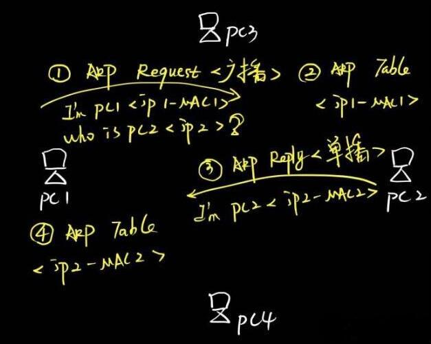 PC2在接收到PC1发送的广播报文后,发现是寻找自己,那么以单播的方式对其进行回应,告知对方自己瞪鯬地址和MAC地址,并记录PC1瞪鯬地址和MAC地址信息;