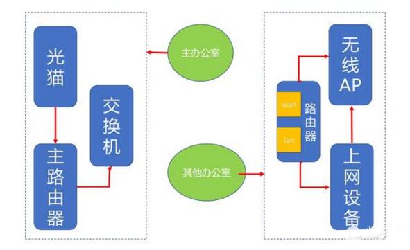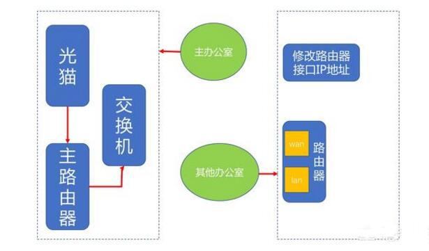 该种扩展,主要是把路由器功能变异,变成一台彻底的交换机,增加其他办公室的上网网络设备数量。这种方式适合连接无线路由器,实现网络的无线扩展,无线部分相当于增加无线AP的功能,也就是实现有线网络和无线网络的双重扩展。