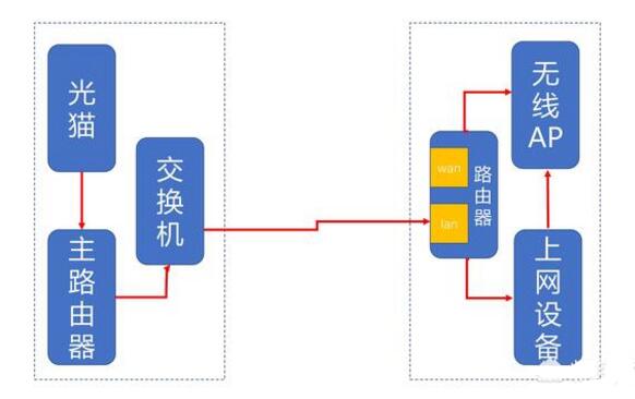 这种路由器的硬件连接方式是从交换机出来的网线直接接入到路由器的Lan口。该场景设置,需要关闭增加路由器的DHCP功能,使接入的网络设备都从主路由器获得IP地址或者从局域网内唯一的DHCP服务器获得IP地址。该场景内的所有网络设备在同一网段,可以实现文件共享,网络打印,家庭投屏。该场景的短板是连接网络设备有限,不能超过252台网络设备(按照C类地址计算,子网掩码为255.255.255.0),包括有线和无线。容易造成广播风暴,网内有一台电脑中毒,有可能造成整个网络瘫痪。