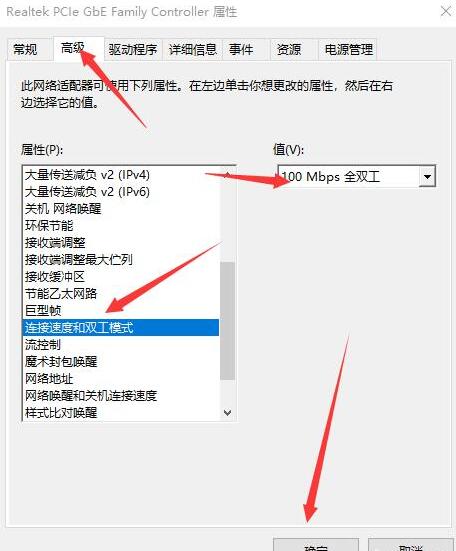 接着在属性窗口找到连接速度和双工模式选项,并鼠标点击,接着在右侧值选项里面找到100Mbps全双红,接着点击确定按钮。随后重启电脑,看是否会断网。相信通过以上方法设置你的电脑会全速运行。有兴趣的朋友可以通过以上方法尝试一下,可以使你的电脑网速全速运行。xw20181001xunji