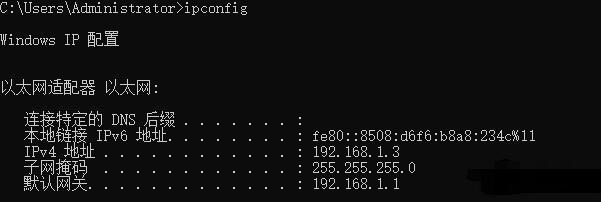 问题提到连接终端显示正常,说明获取IP地址正常,可以在DOS中进行查看,在DOS窗口,通过“ipconfig”命令来查看IP地址的情况。