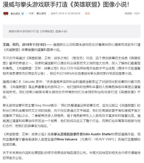 拳头游戏在今天凌晨宣布将与漫威合作打造《英雄联盟》故事背景的漫画和图像小说。首部作品暂定名为《英雄联盟:艾希:战争之母》,将以寒冰射手艾希作为主角。该作将从12月19日起在数字平台连载,稍后于明年5月发行英文纸质版图像小说。中国大陆地区的相关合作细节需要等待后续官方公告。