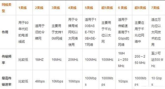 可以参看下图,3类线、5类线、超5类线至7类线均属于网线;不同的标准,网线支持的电气性能不同,一般是铜芯线缆的粗细也不同;3类线目前基本被淘汰,也就是说网线起步支持的传输带宽在百兆。若家中带宽在百兆以下,那么5类线缆就能够满足需求;若家中带宽在百兆以上,那么至少就需要使用超5类线以上的线缆。(至于屏蔽和非屏蔽网线,家庭使用中意义不大,这里就不详细阐述了)